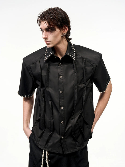 【25s Jun.】Hot Diamond Pearl Shoulder Pad Short Sleeve Shirt