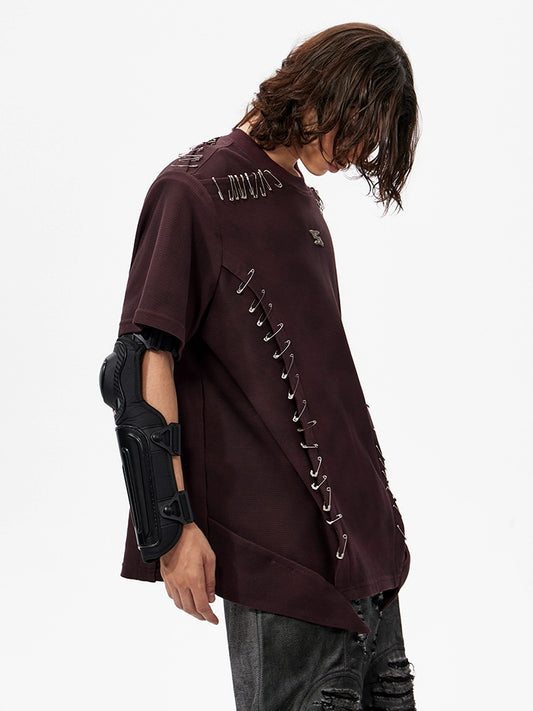 【25s Jul.】Safety Pin Patchwork Design Short Sleeve Top with Shoulder Pads