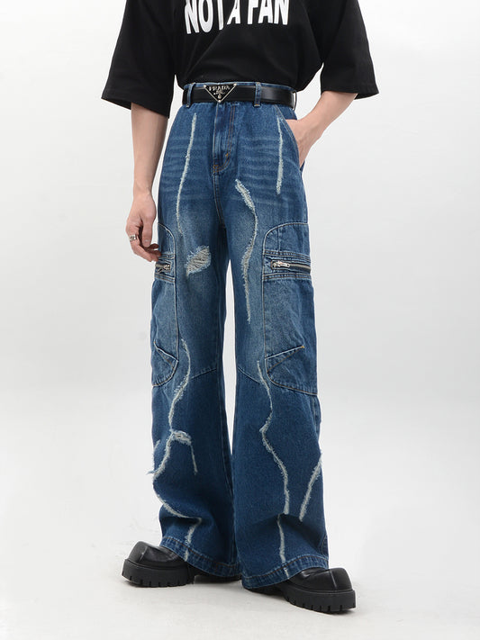 【25s Mar.】Multi-pocket Ripped Ribbon Straight Jeans