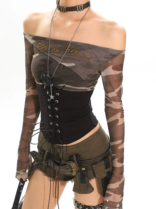 【25s Jun.】Mesh Cinched Tie Street Off-Shoulder Top