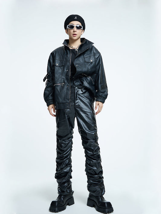 【23s September.】Loose Casual Retro PU Leather Jacket+ Leather Pants-M/L