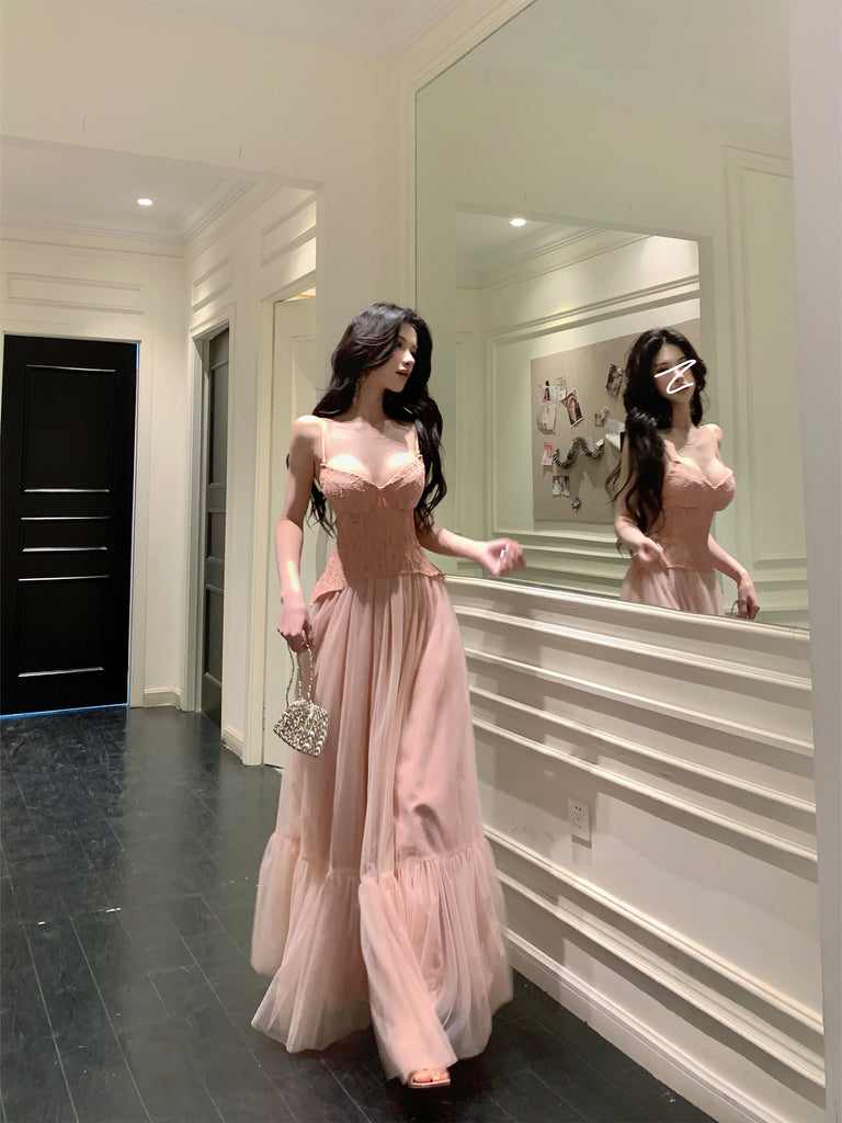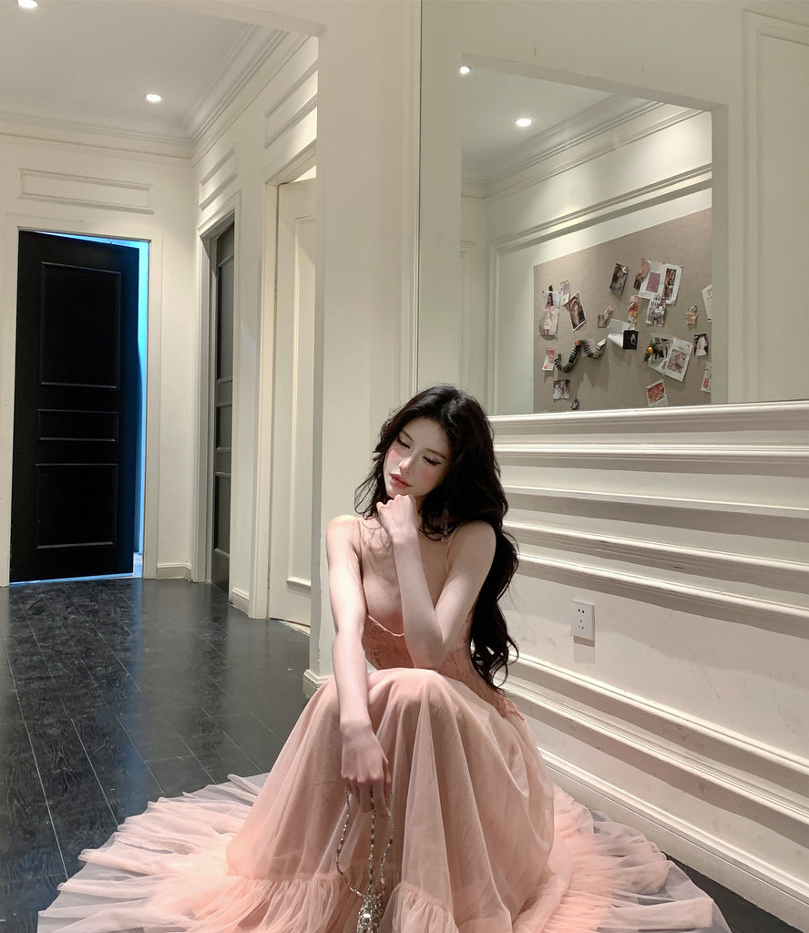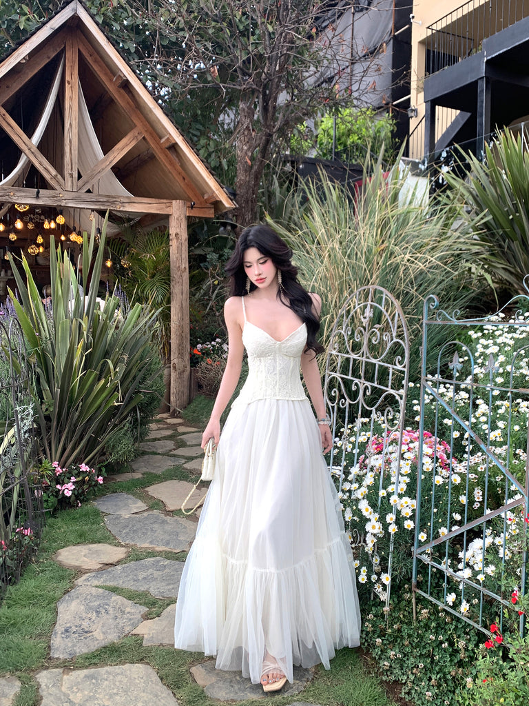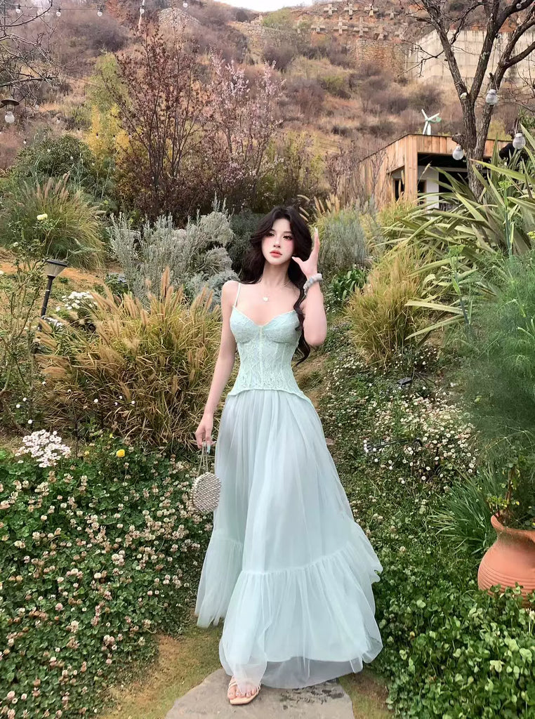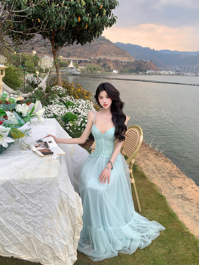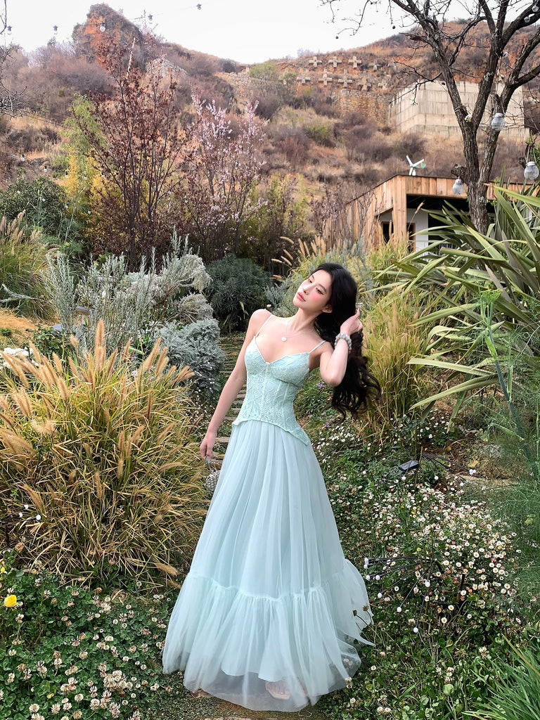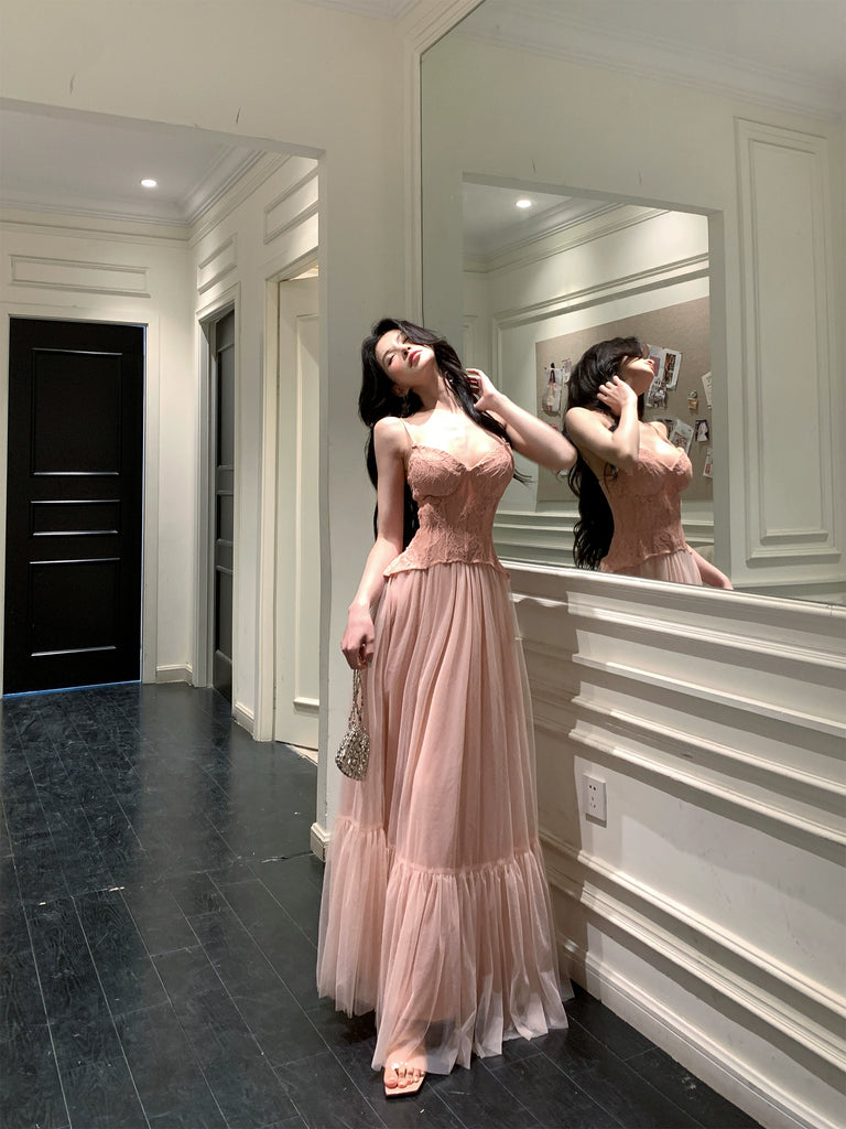 【25s Apr.】Lace Spaghetti Strap Mesh Patchwork Dress