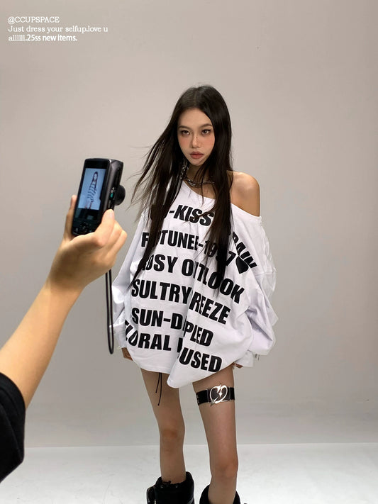 【25s Nov.】Letter Print Off-Shoulder Long-Sleeve Sweatshirt