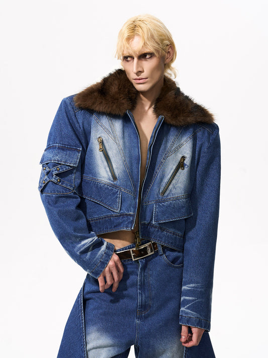 【25s Oct.】Plush Patchwork Denim Distressed Design Jacket / Jeans