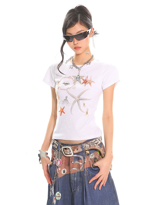 【25s June.】Starfish Shell Print Slim T-shirt