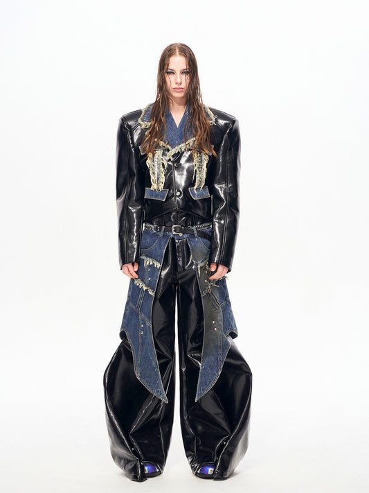 【25s Oct.】Denim Patchwork Red Leather Jacket/Double Waist Leather Pants