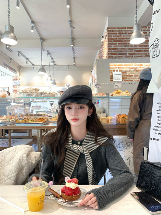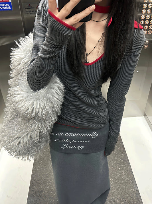 【25s Feb.】V-neck Red and Grey Contrast Striped Top
