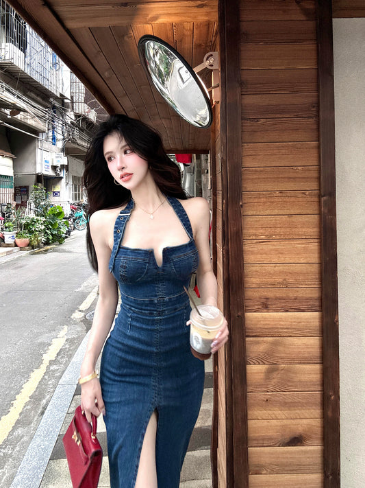 【25s Aug.】Lace Stitching Satin Halterneck Dress