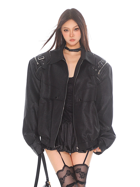 【24s Oct.】Niche Retro Bow Lapel Leather Jacket + Leather Skirt