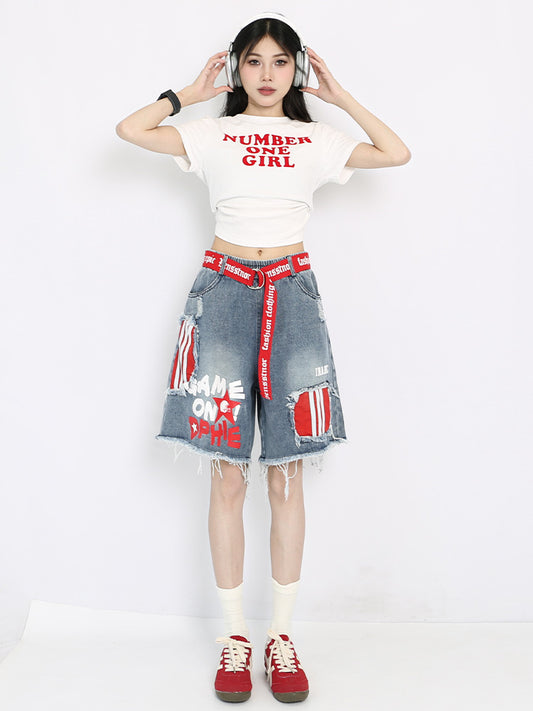 【25s Aug.】Vintage Striped Patchwork Distressed Denim Shorts