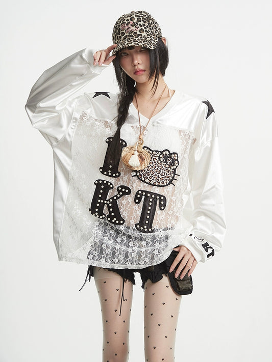 【25s Aug.】Loose V-neck Lace Pearl Stitching Long Sleeves