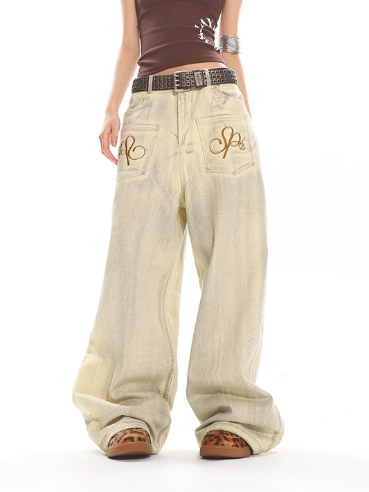 【25s May.】Grunge Wash Embroidered Wide Leg Jeans