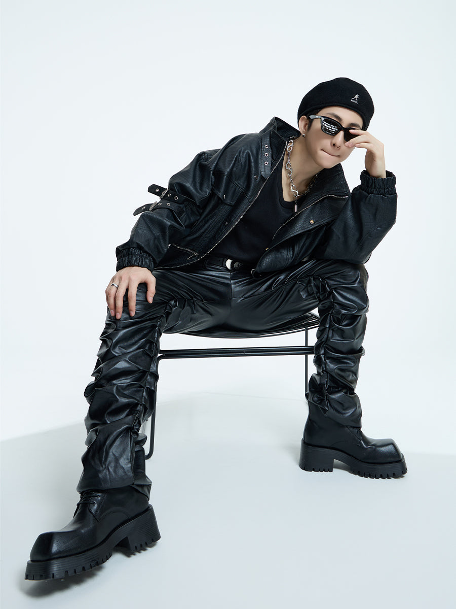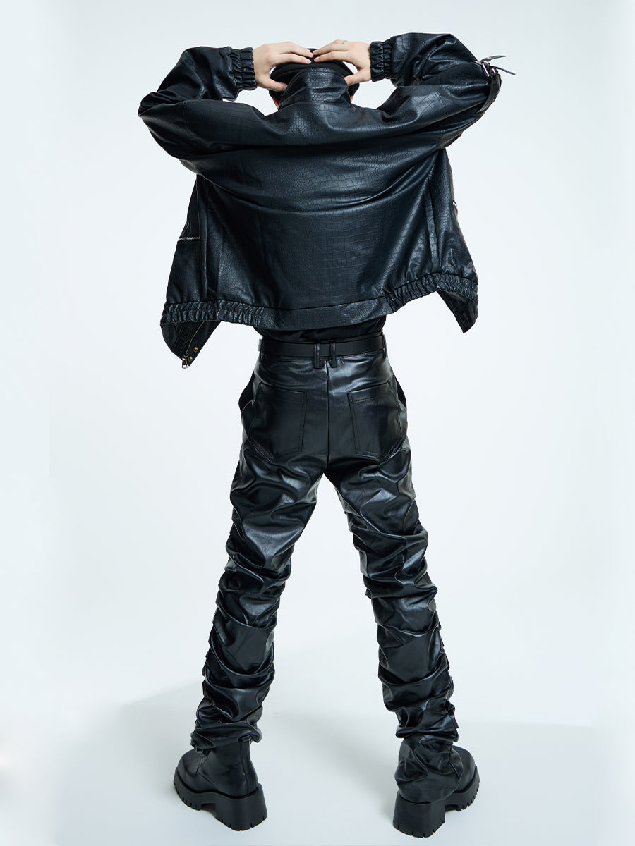 【23s September.】Loose Casual Retro PU Leather Jacket+ Leather Pants-M/L