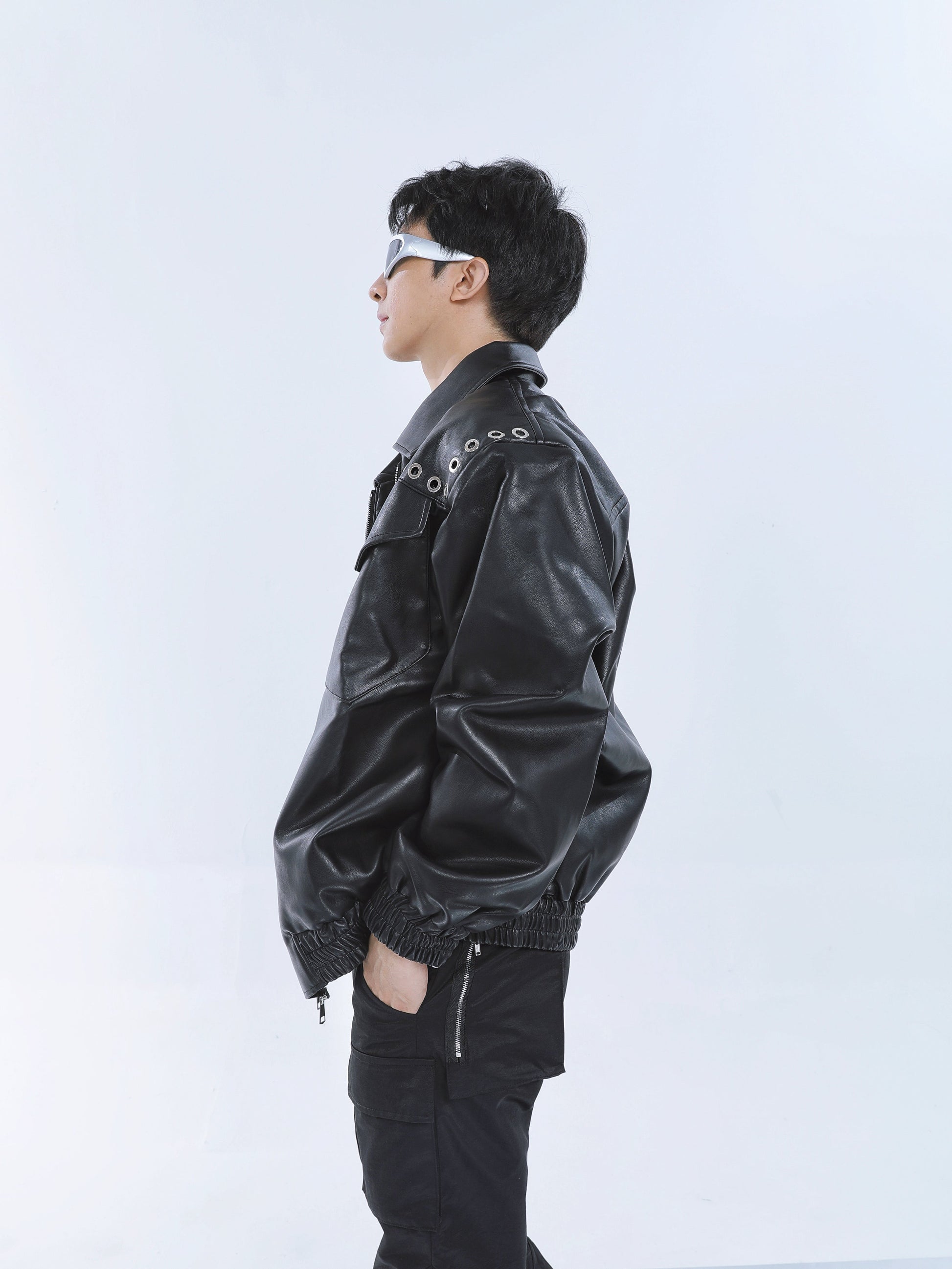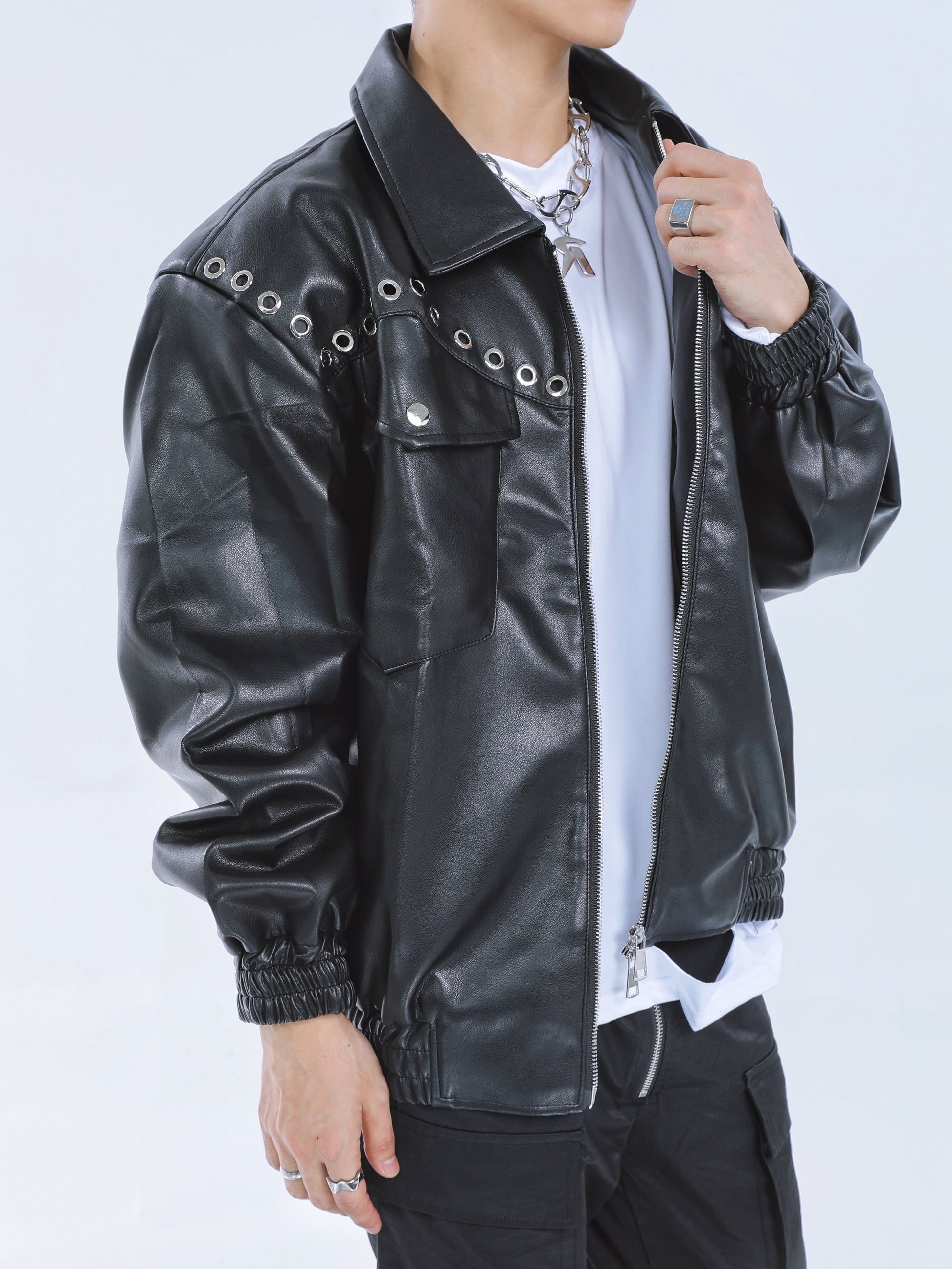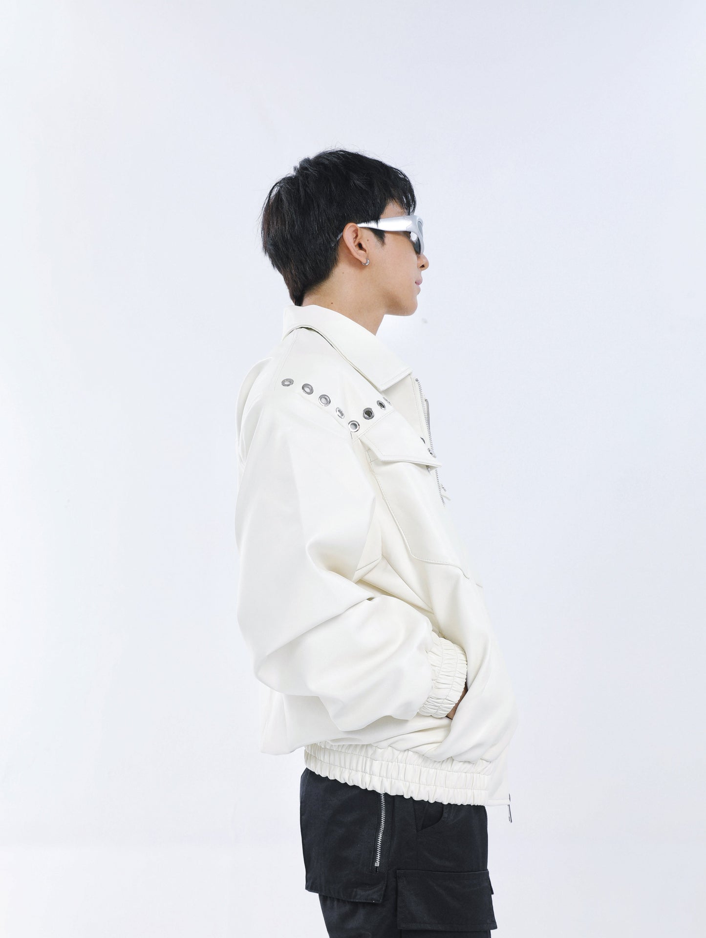 【23s September.】Metal Rivet-embellished Silhouette Leather Jacket -L