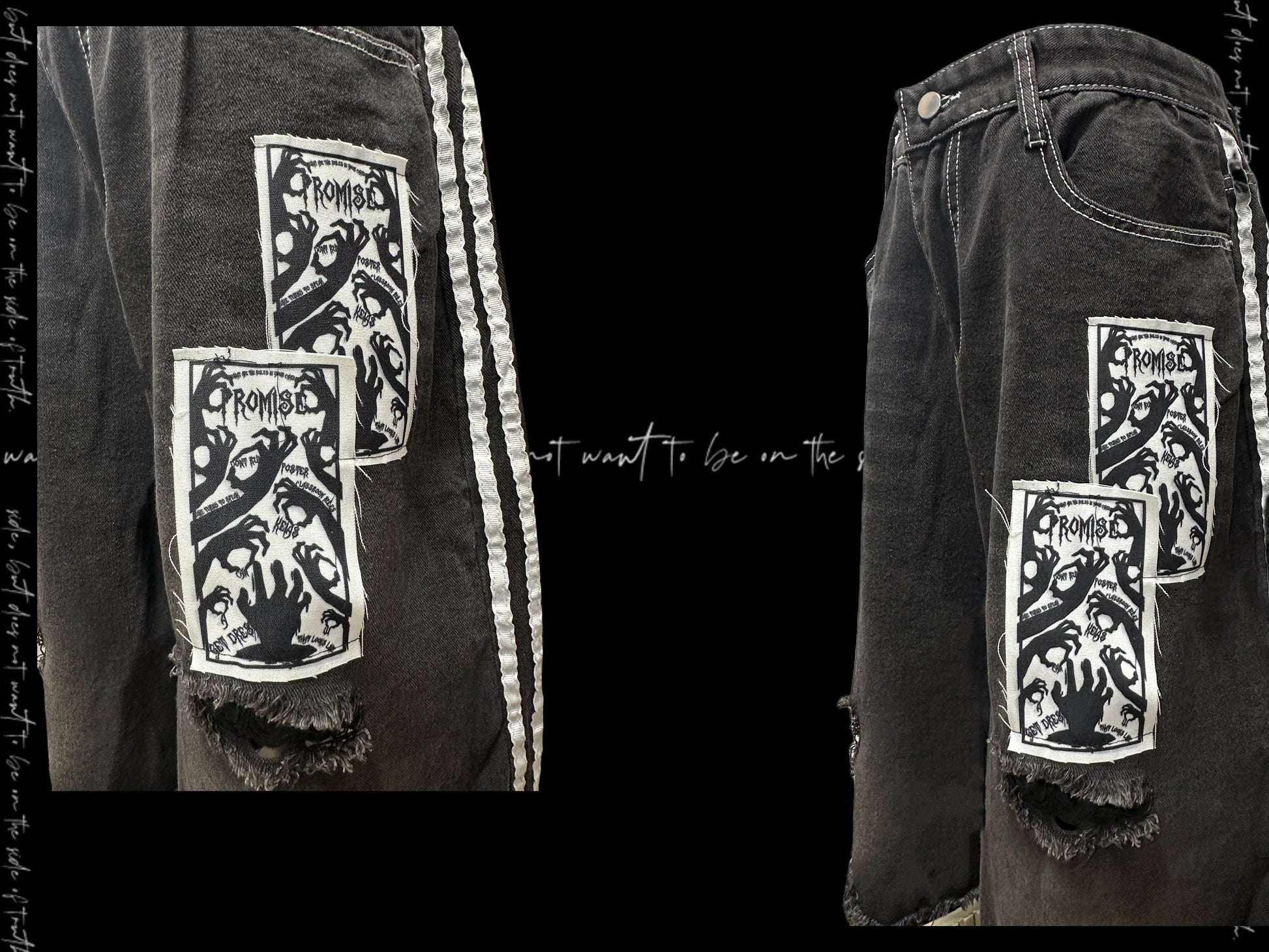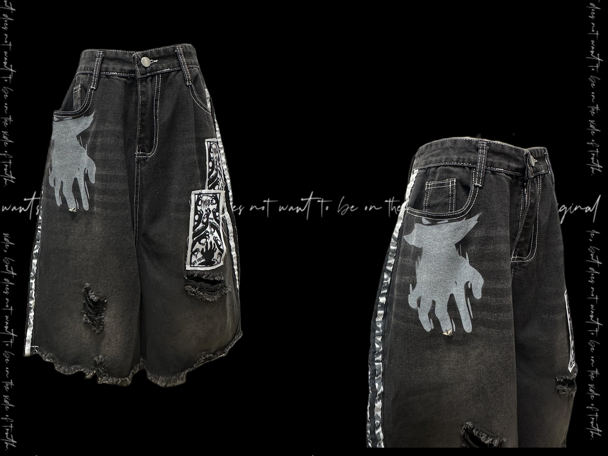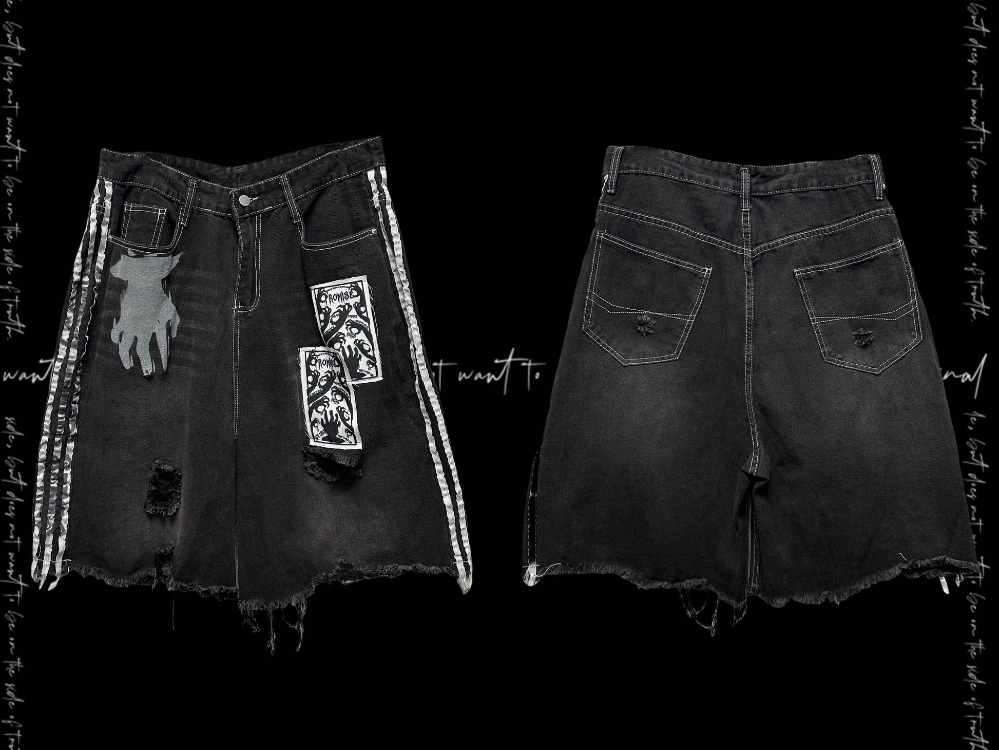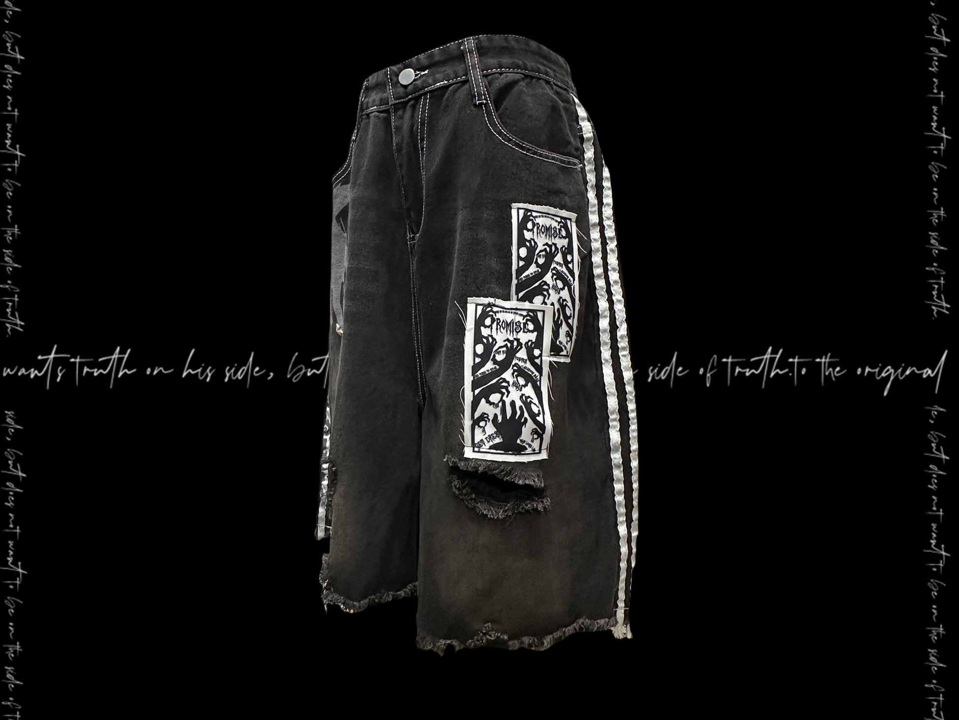 【25s Aug.】Black Striped Distressed Denim Shorts with Patch Details