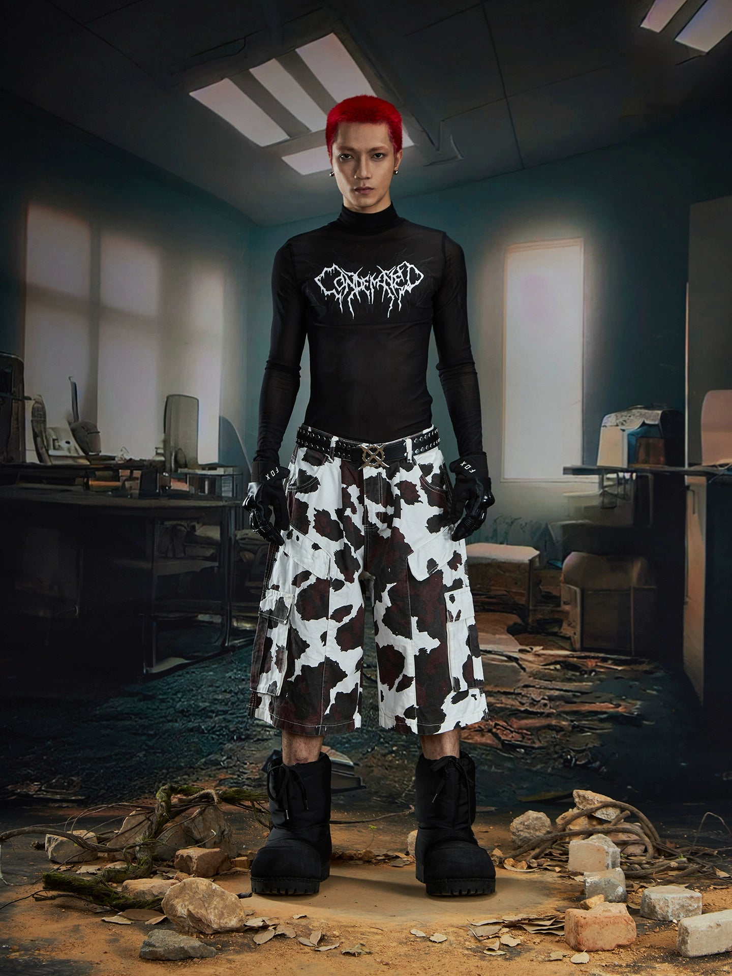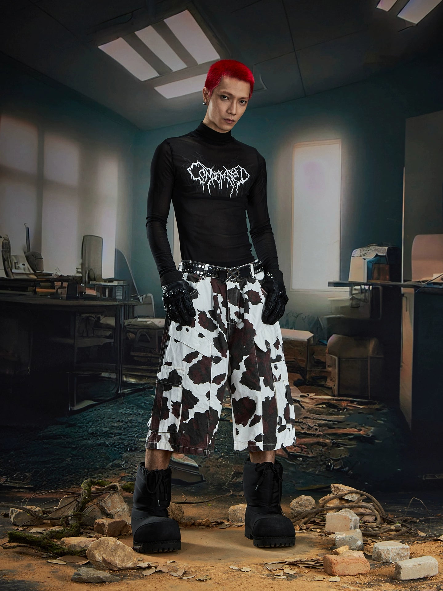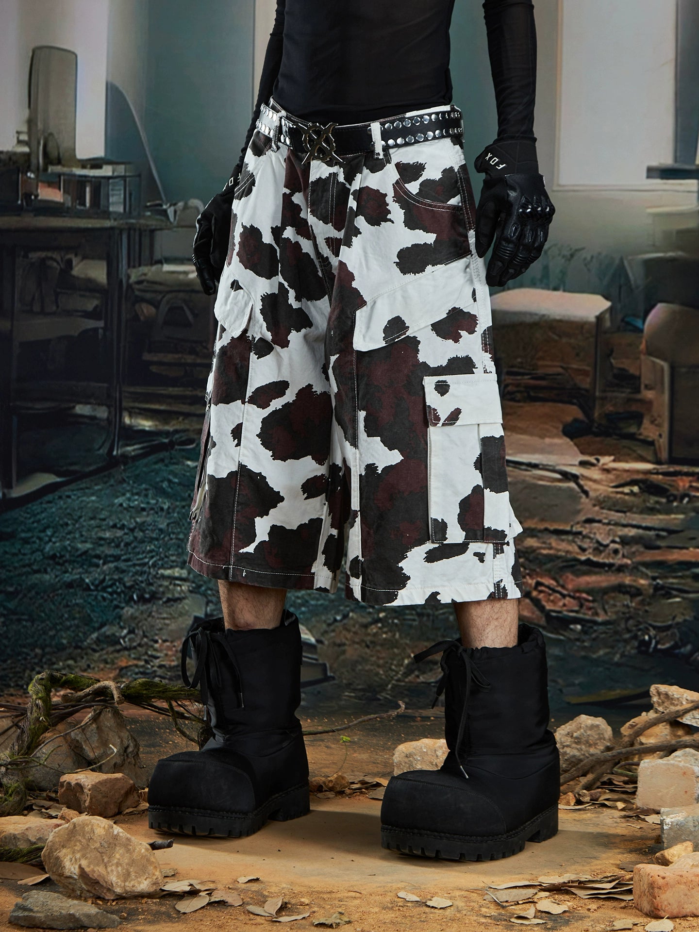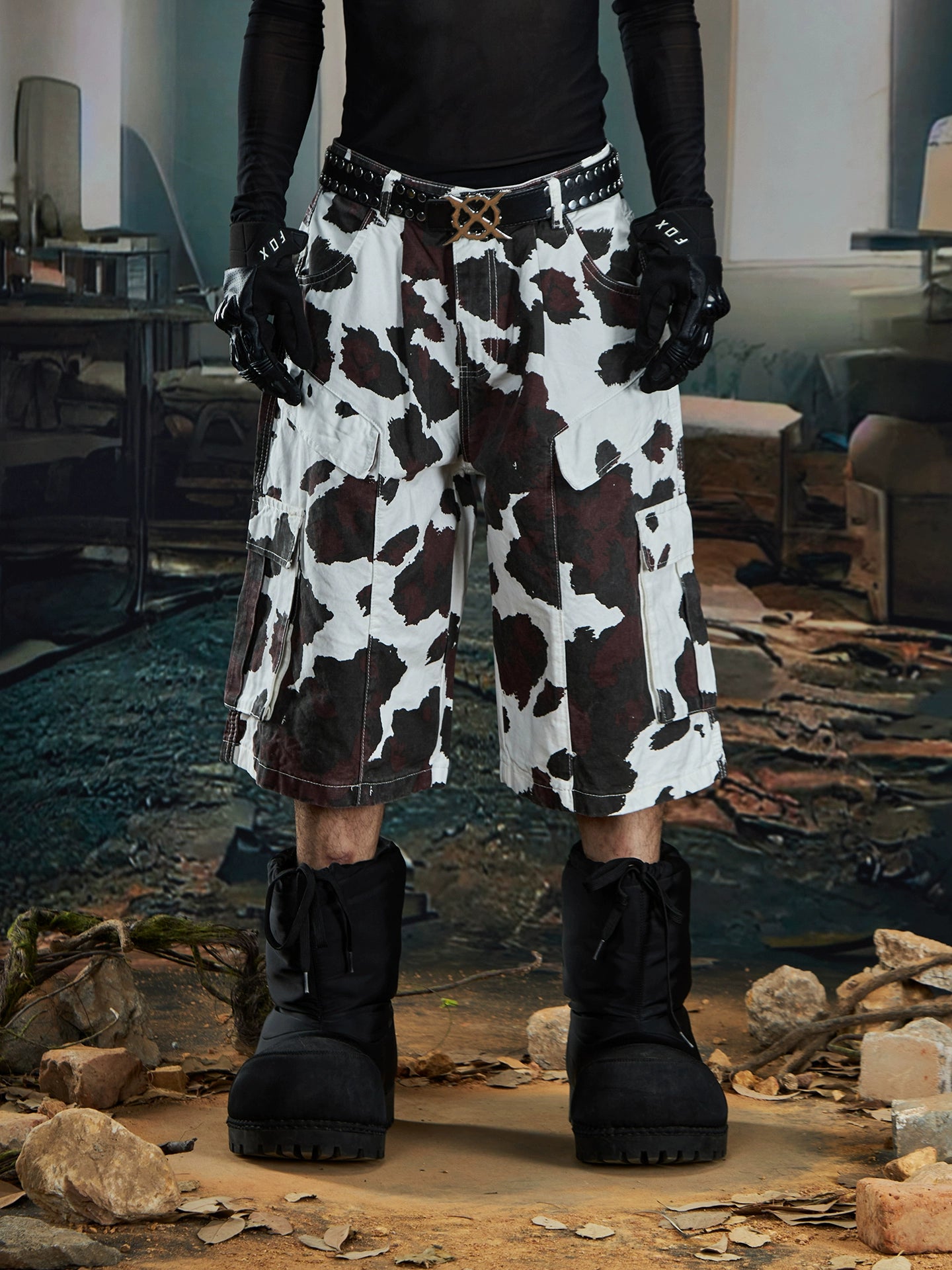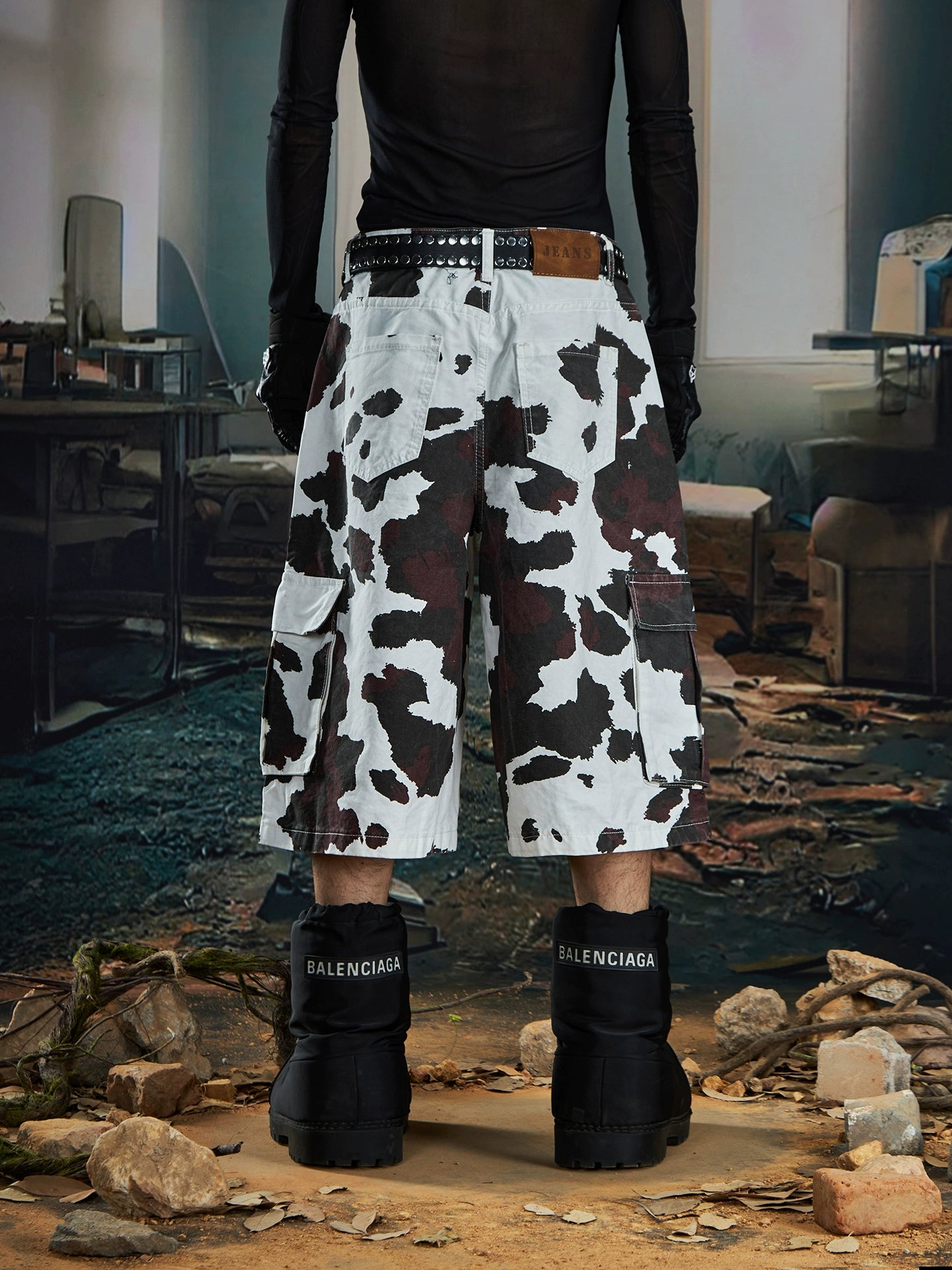 【25s Aug.】Deconstructed Patchwork Cargo Cow-Print Cropped Pants
