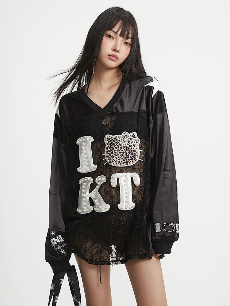 【25s Aug.】Loose V-neck Lace Pearl Stitching Long Sleeves