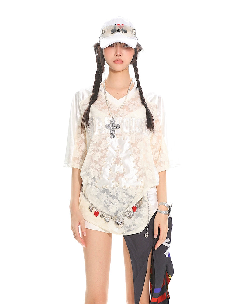 【25s Jun.】Lace Letter Beaded V-Neck Loose-Fit Mesh Jersey