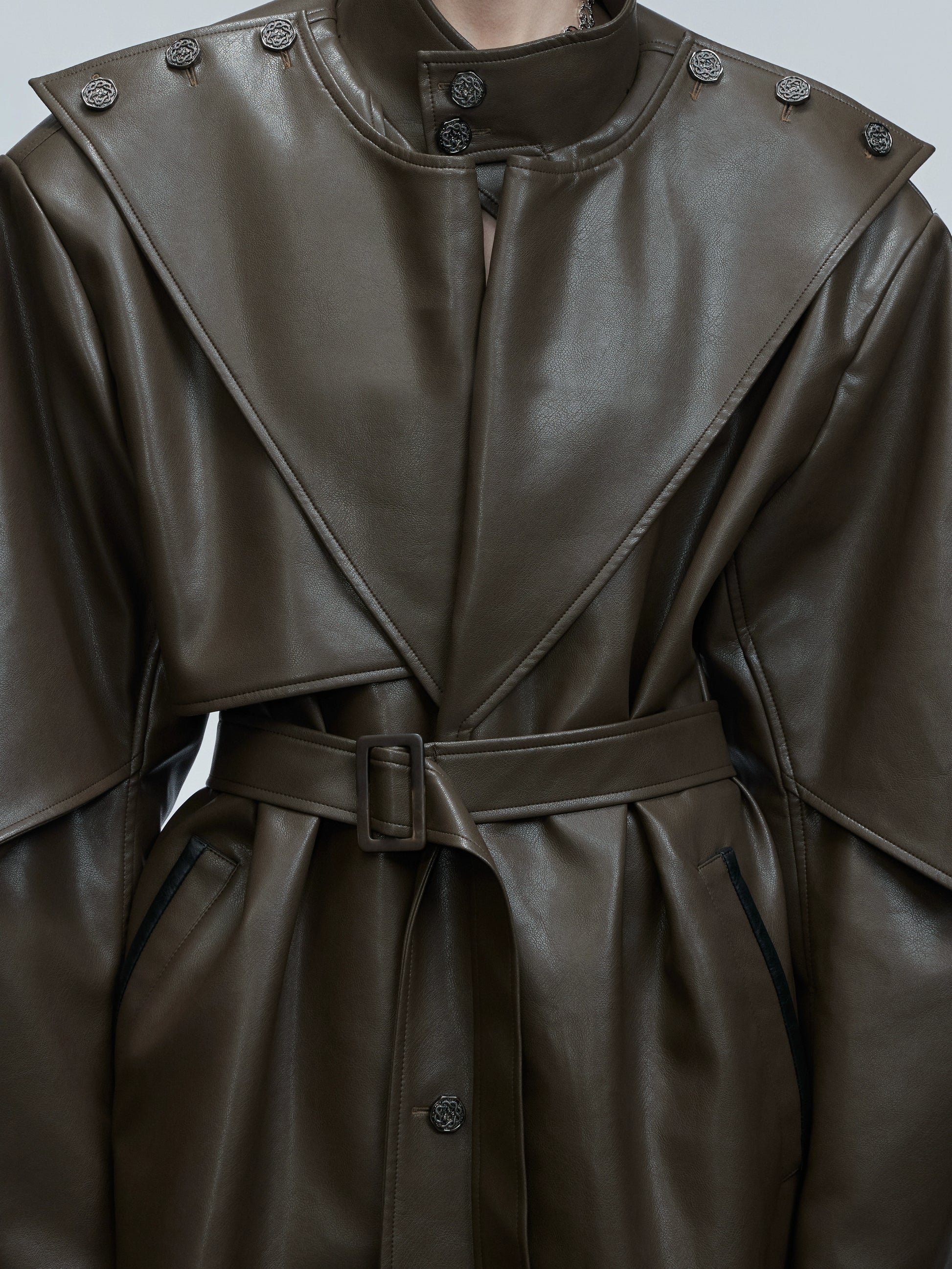 【25s Nov.】Deconstructed Stand-up Collar Copper Coin Button Leather Trench Coat