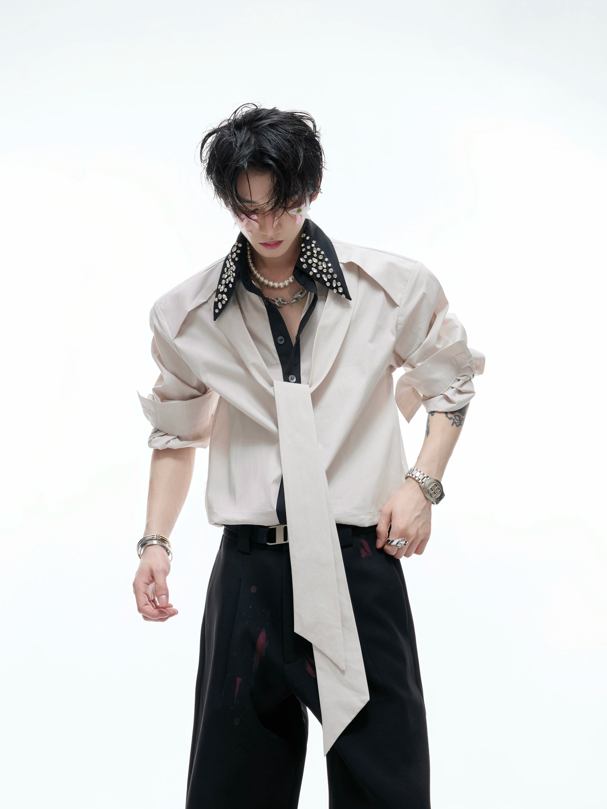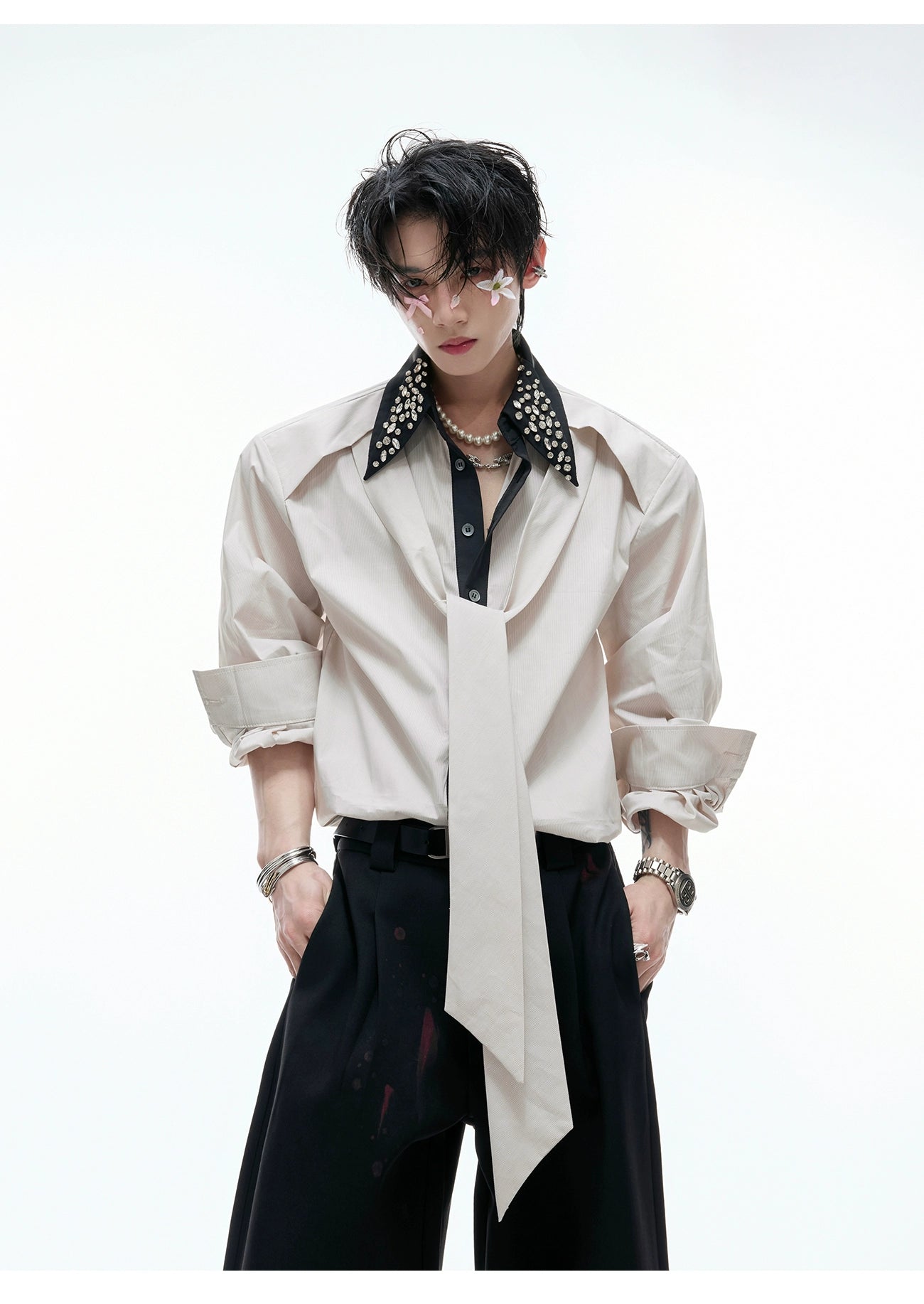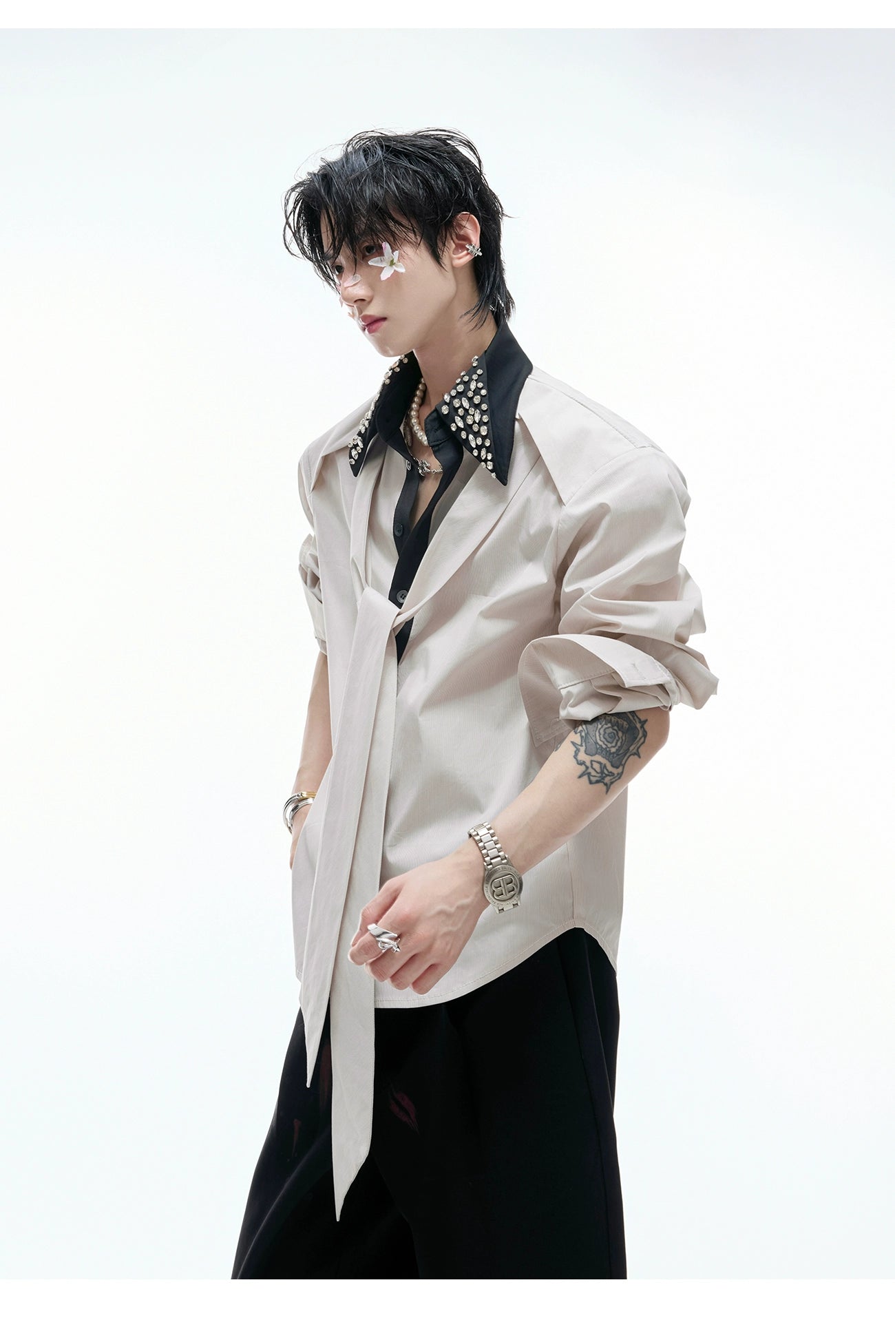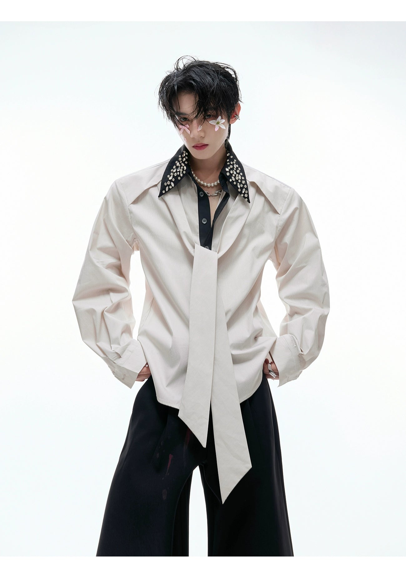 【25s Aug.】Diamond-embellished Ribbon-trimmed Shirt