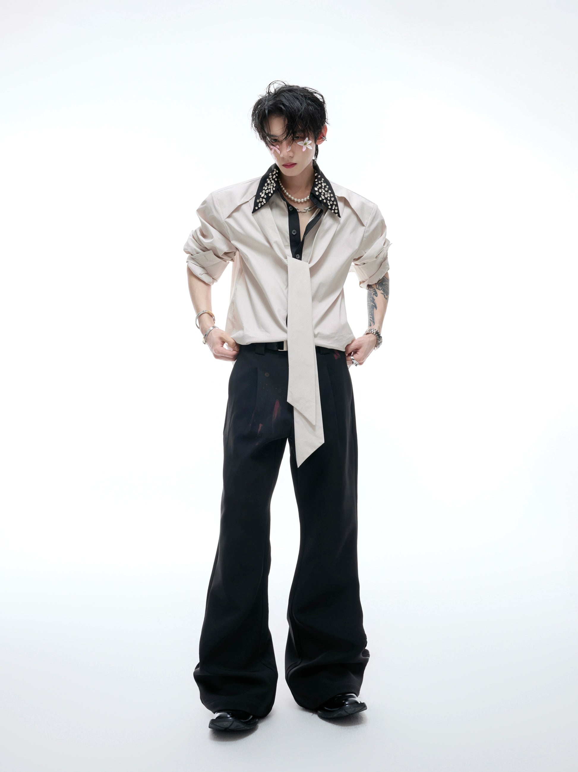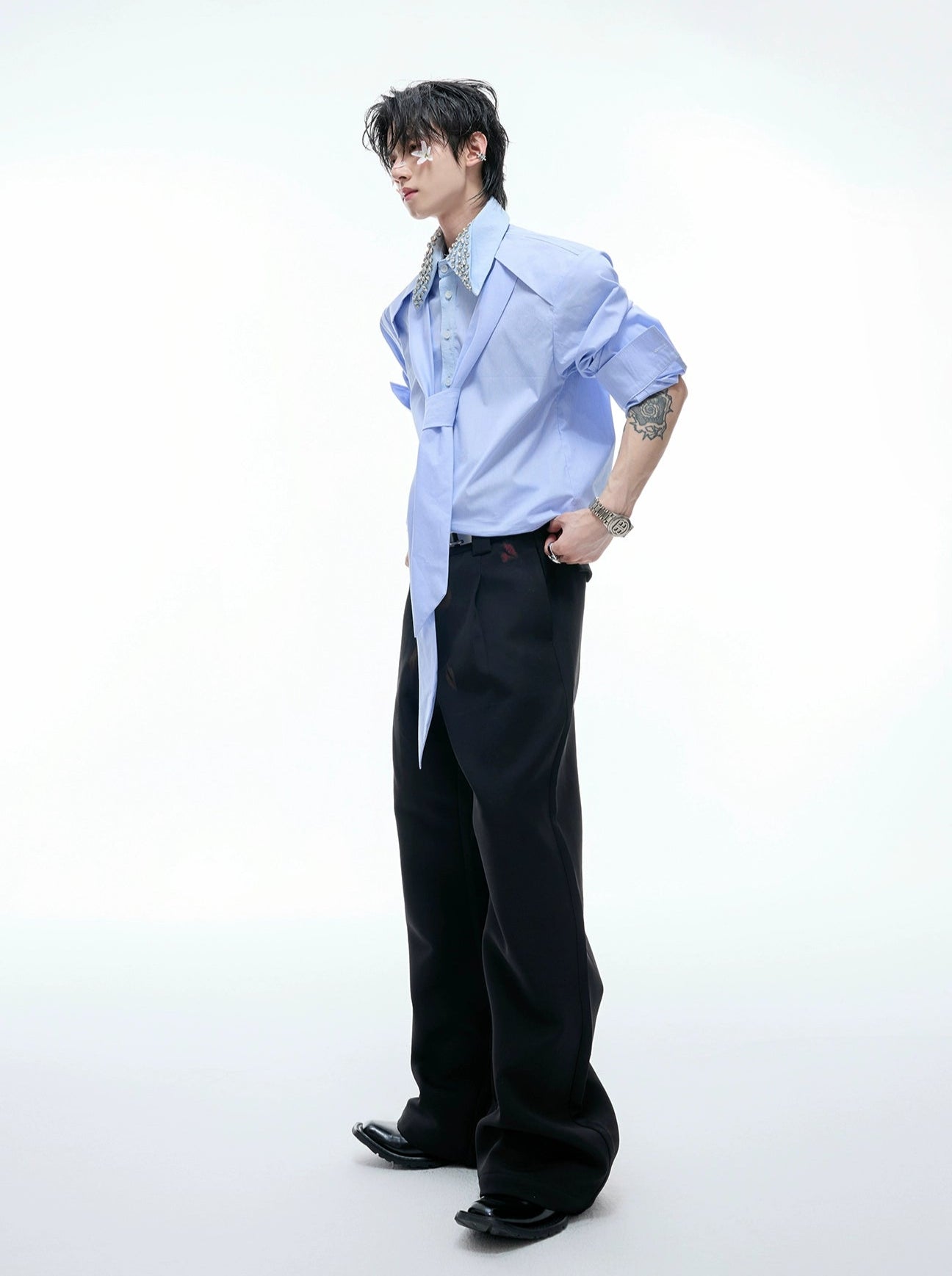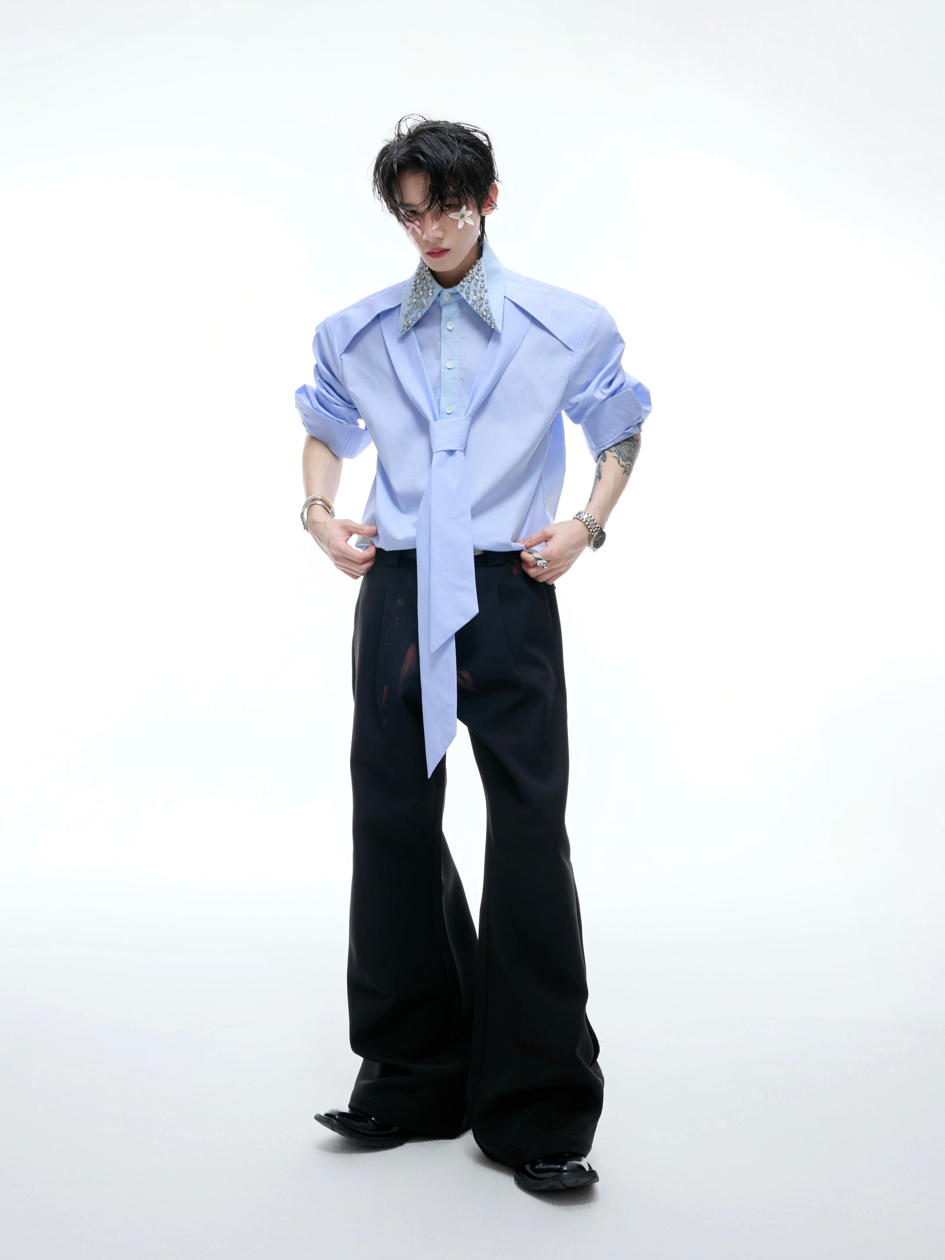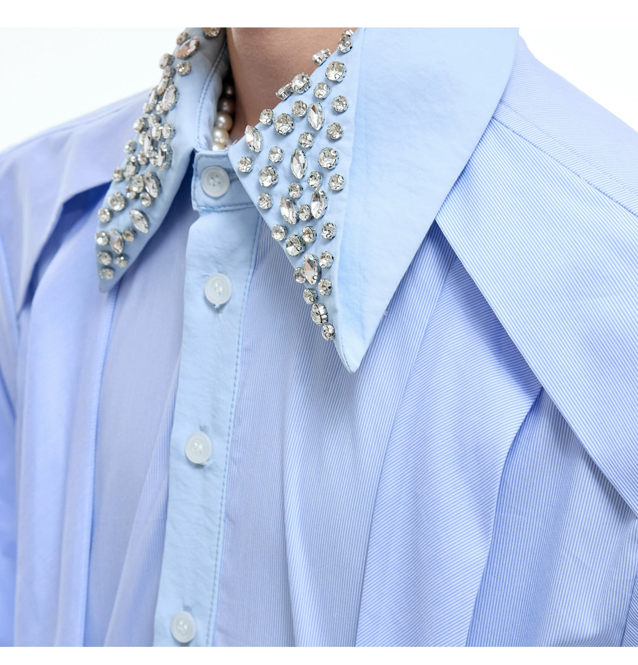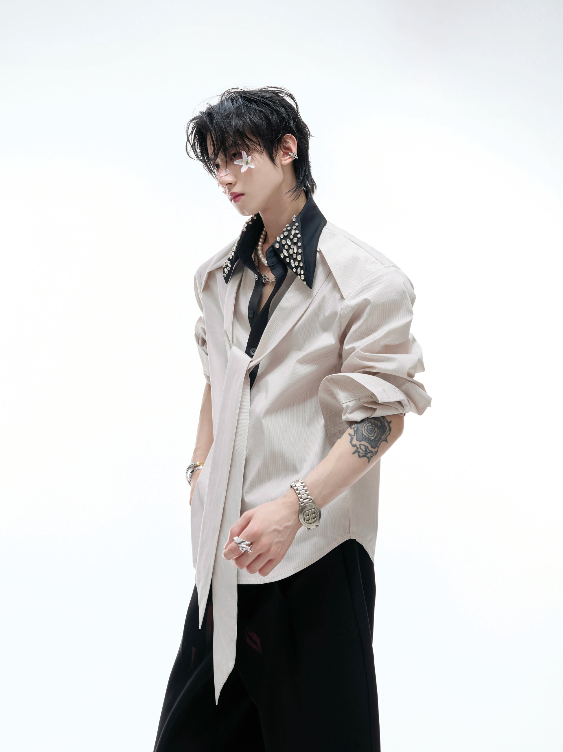 【25s Aug.】Diamond-embellished Ribbon-trimmed Shirt