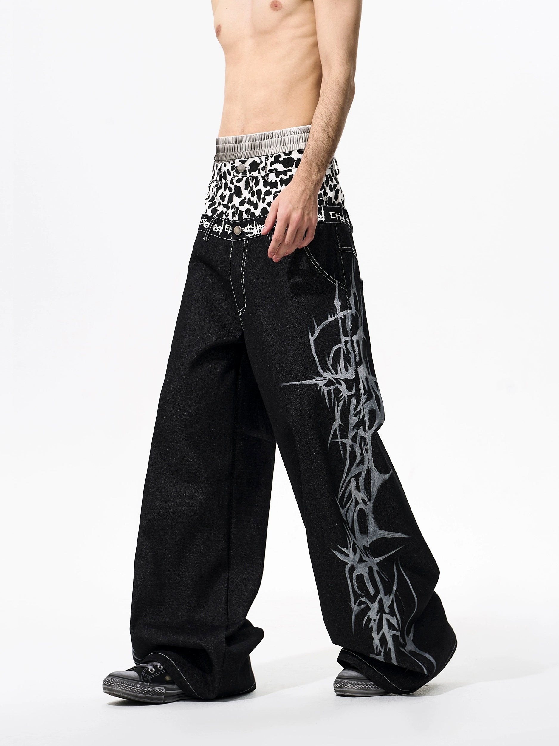 Hand-painted Thorn Leopard Print Double Waistband Jeans